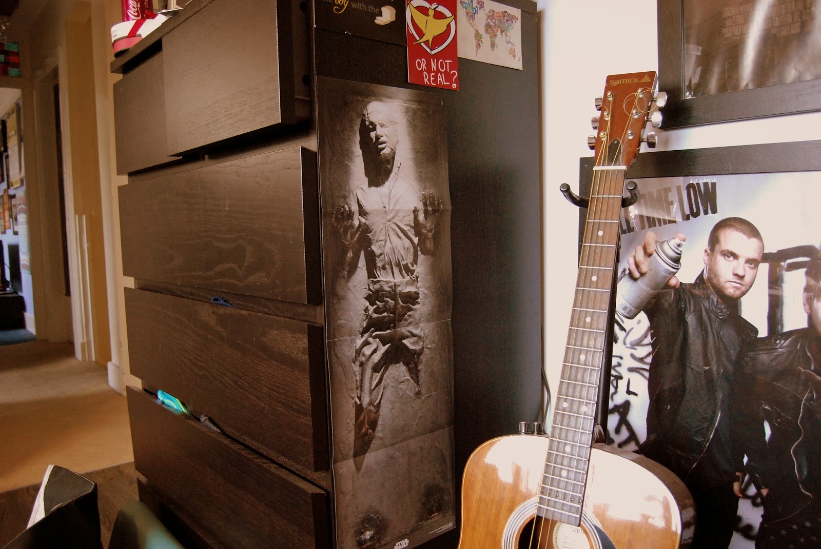 Another Star Wars addition to the Loot Crate is the wonderful Star Wars poster of Han Solo encased in carbonite which is now on my chest of drawers near my guitar and other posters because I prefer the original Star Wars trilogy to the latest trilogy. My geeky friends aren't getting their hands on it.