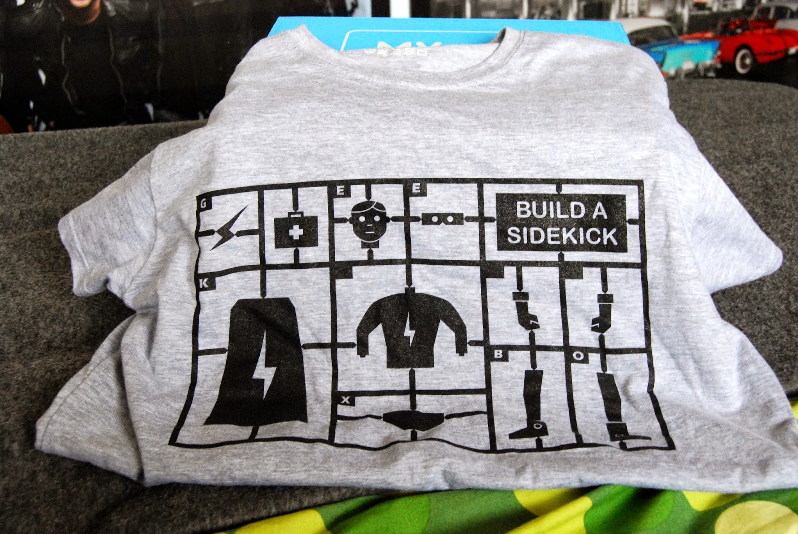 I loved the design on this month's T-shirt just for the simple colour scheme and simplicity of the whole design alone. It doesn't seem to me that the design is based on any particular sidekick but the generic feel reminds me of older comics or films where they spoof sidekicks as they tend to be similar just to give the hero someone to bounce ideas off, like they all came from a kit like this.